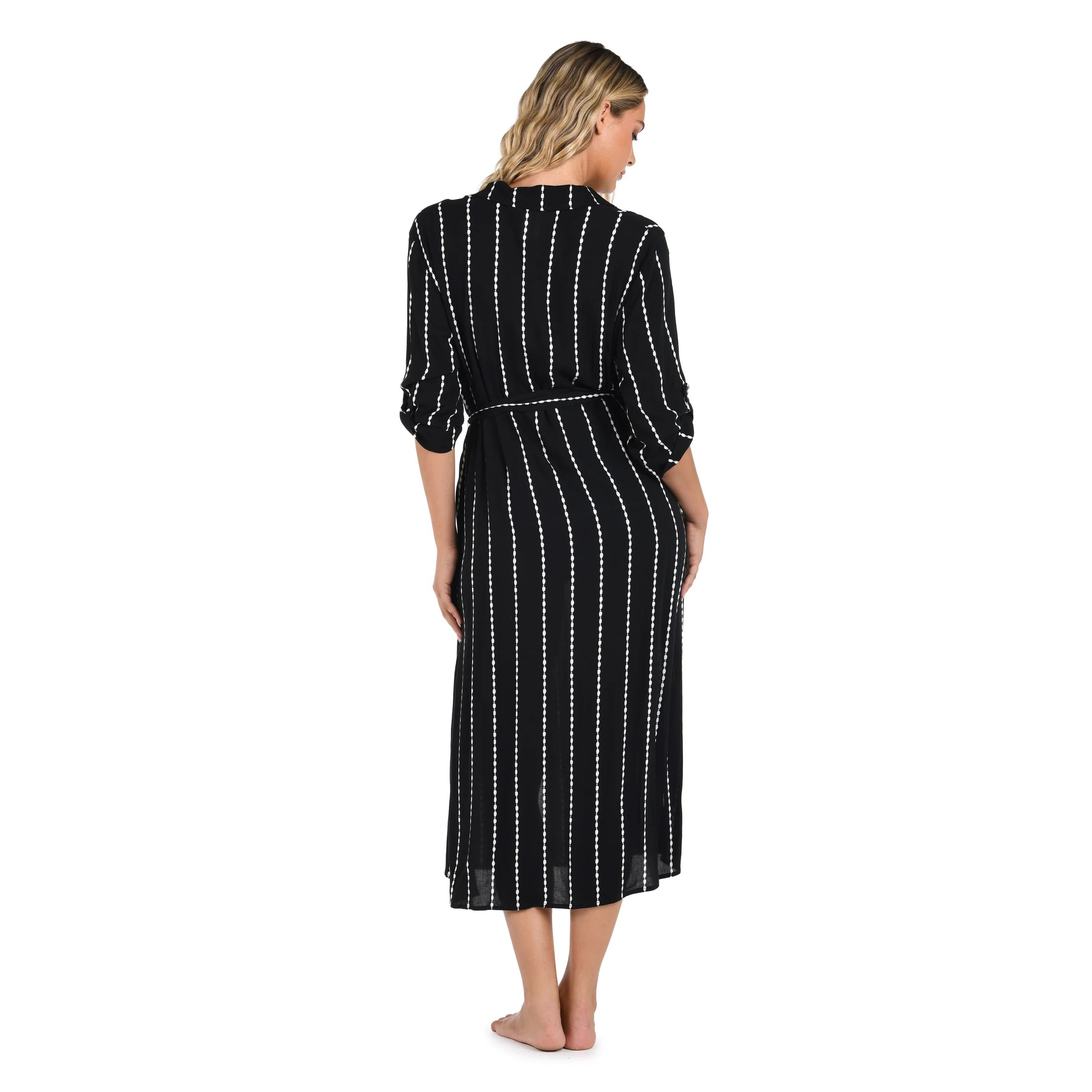 A chic black background with vertical rows of varying-sized white dots gives this shirt dress a modern, dynamic look. The high-contrast pattern is both eye-catching and versatile, offering a stylish way to elevate your wardrobe. With a button-front design, 3/4 sleeves, and side slits, this dress brings a breezy, cool vibe perfect for those warm summer nights.