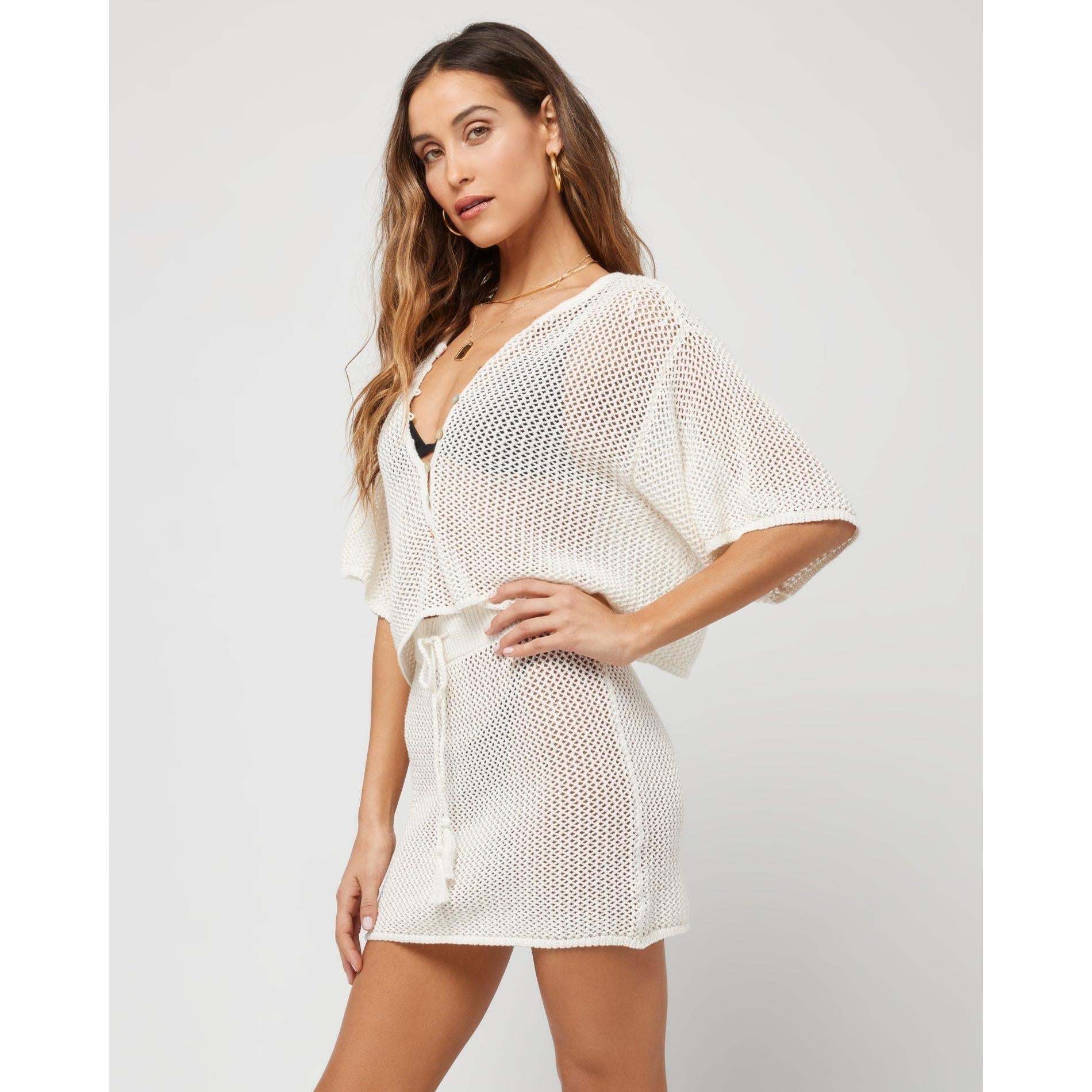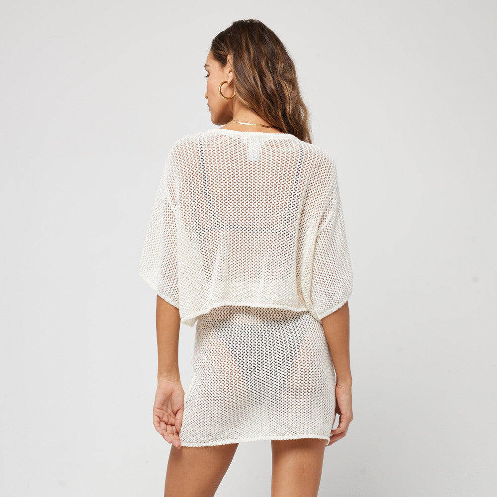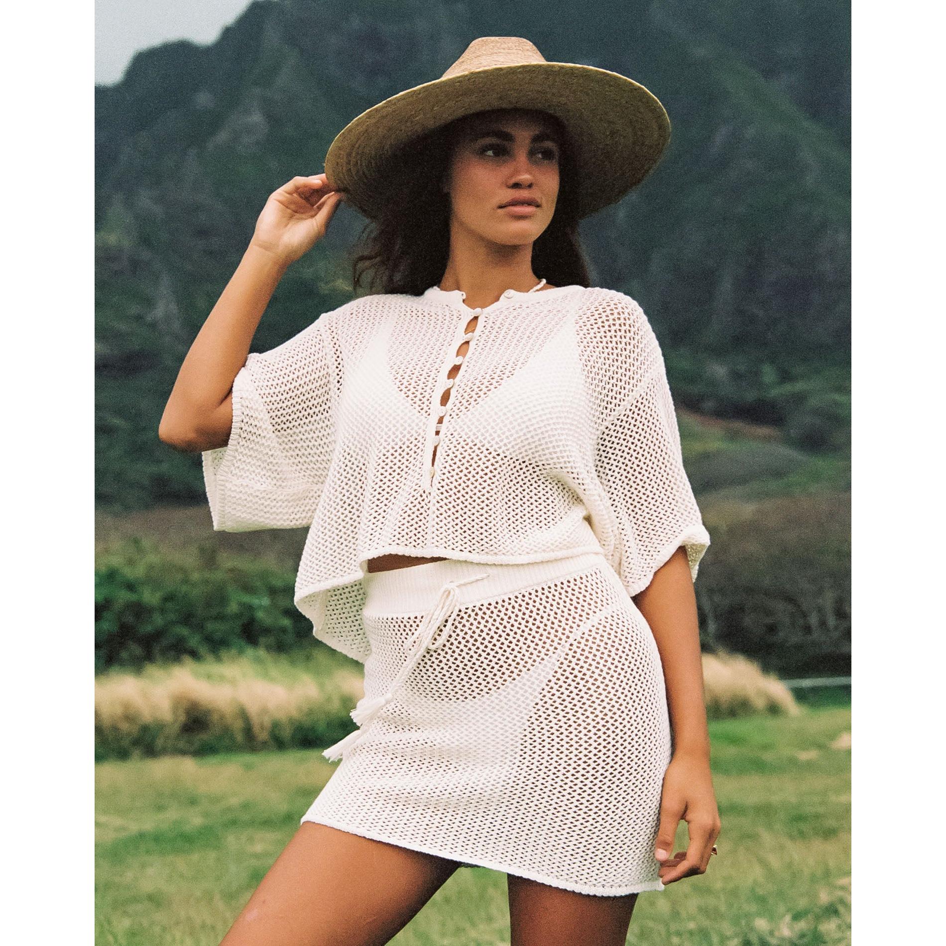 As easy to wear as she looks, the Coast Is Clear Skirt is a crochet ribbed mini skirt with a tie at the waistband. Wear it as a set with the Coast Is Clear Top.